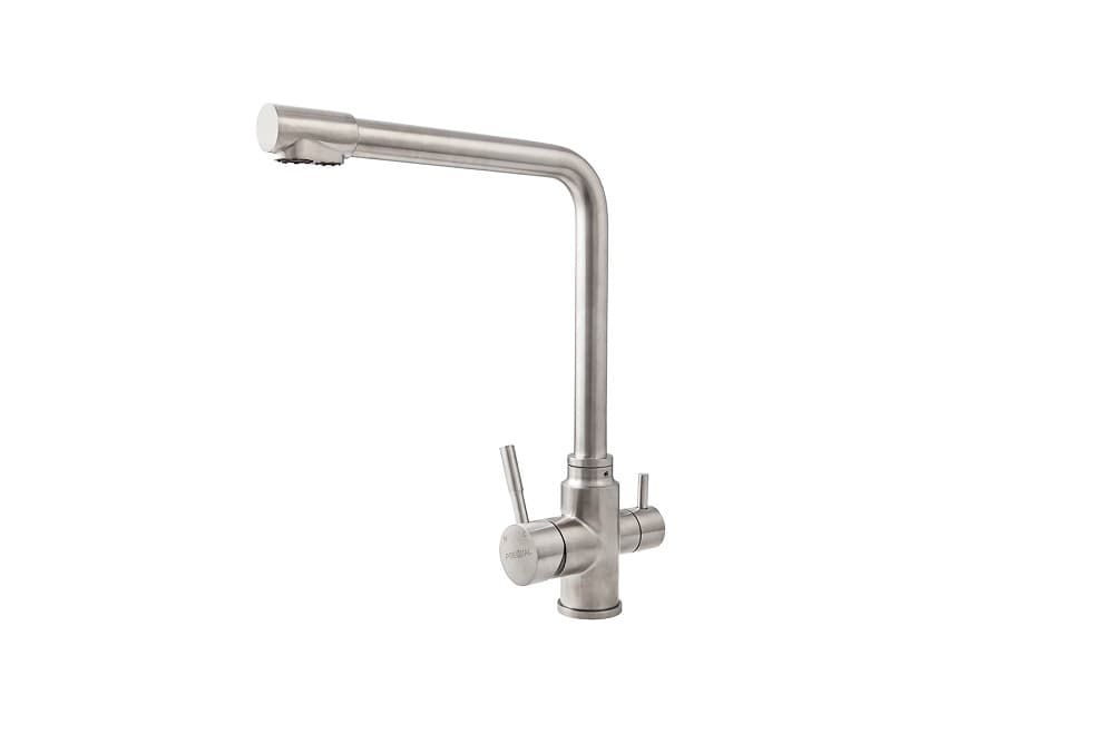 Комбинированный смеситель для водопроводной и фильтрованной воды из коллекции «Чистая вода» (двухрычажные смесители). В прямоугольном изливе с углом 90гр. в параллельных изолированных каналах вода из разных источников не смешивается. Бренд: Premial Высота, мм: 325 Ширина, мм: 265 Форма: Прямоугольная Корпус смесителя: Нержавеющая сталь Цвет смесителя: Графит Количество кранов: 2 Материал: Нержавеющая сталь Высота излива, мм: 290 Предельное давление, кПА: 900 Рабочая температура, С: 65 Диаметр картриджа, мм: 35 Упаковка, шт: 1