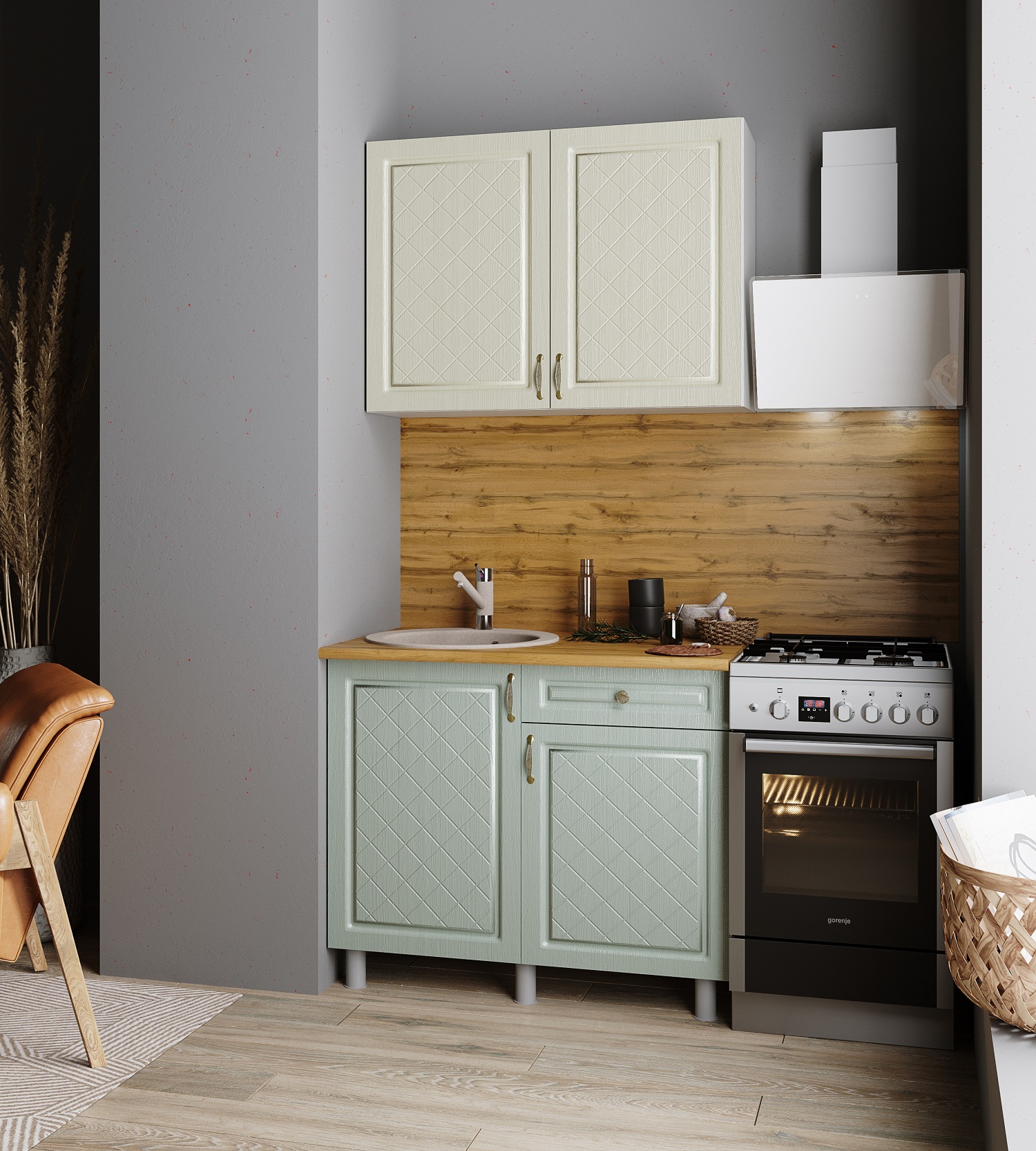 Кухня "Версаль Готовое решение" 1,0 м Айвори/Васаби без стол-цы (star)